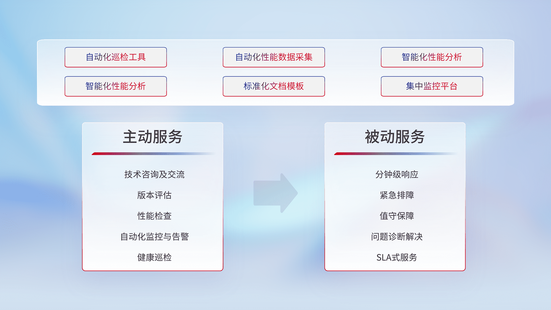 智能化工具和标准化文档,,,,保障服务质量,,,,提供主动服务(包含技术咨询、、版本评估、、性能检查、、、自动化监控与告警、、、、健康巡检)和被动服务包含(分钟级响应、、、紧急排障、、、、值守保障、、、、问题诊断解决、、、、SLA服务)。。。